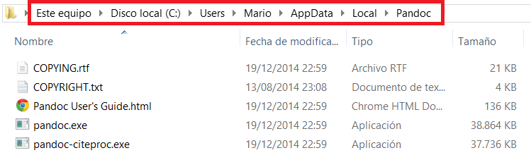 - Paso 4. Ahora tenéis que copiar como texto (click derecho, "copiar como texti") la ruta del directorio de instalación de Pandoc: